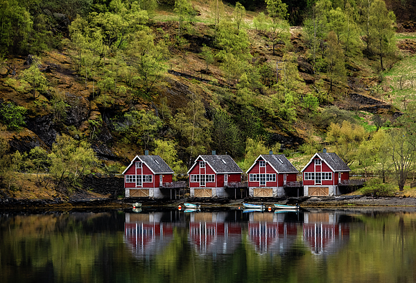 Norway is one of the most scenic countries I've visited, and 'm already planning to return! In the small village of Flam, a row of red fishing cabins with triangular roofs sits by the water's edge against a backdrop of green hillsides. Their reflections are visible in the calm water, with small boats tied up along the docks.